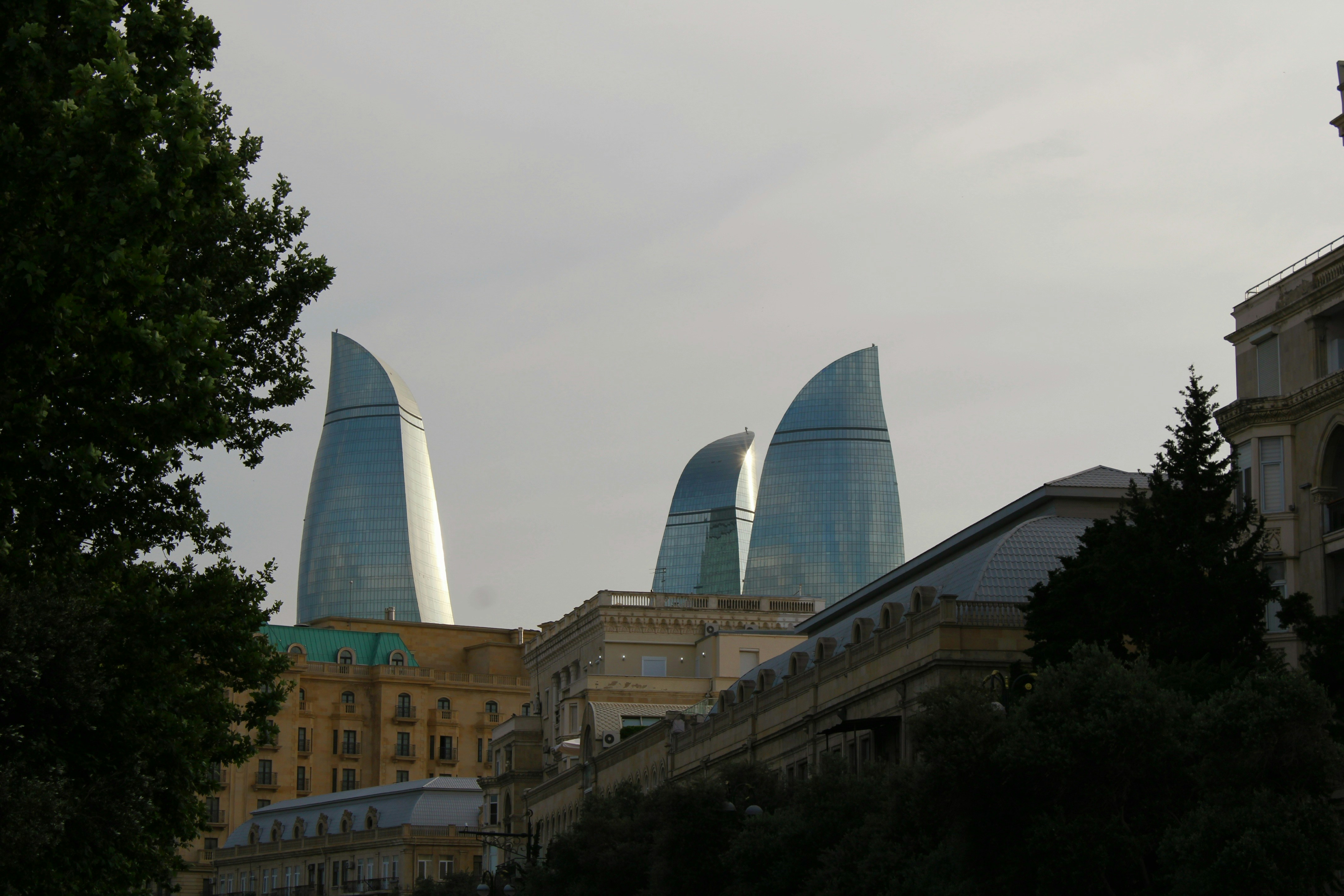 Oil-money skyline over 12th-century walls and Caspian salt winds